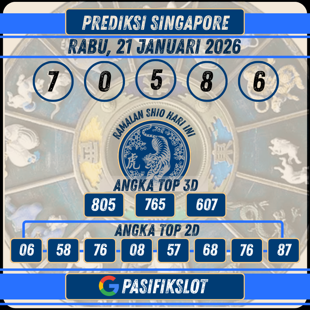 PASIFIKSLOT | Selamat datang di halaman prediksi togel Singaporepools terbaru untuk tanggal 21 Januari 2026. Kami di Pasifikslot selalu berusaha memberikan prediksi angka jitu yang akurat dan terpercaya untuk membantu Anda meraih kemenangan maksimal. Dengan analisis data keluaran sebelumnya dan pola angka, kami menyajikan angka-angka terbaik untuk Anda gunakan sebagai referensi taruhan.