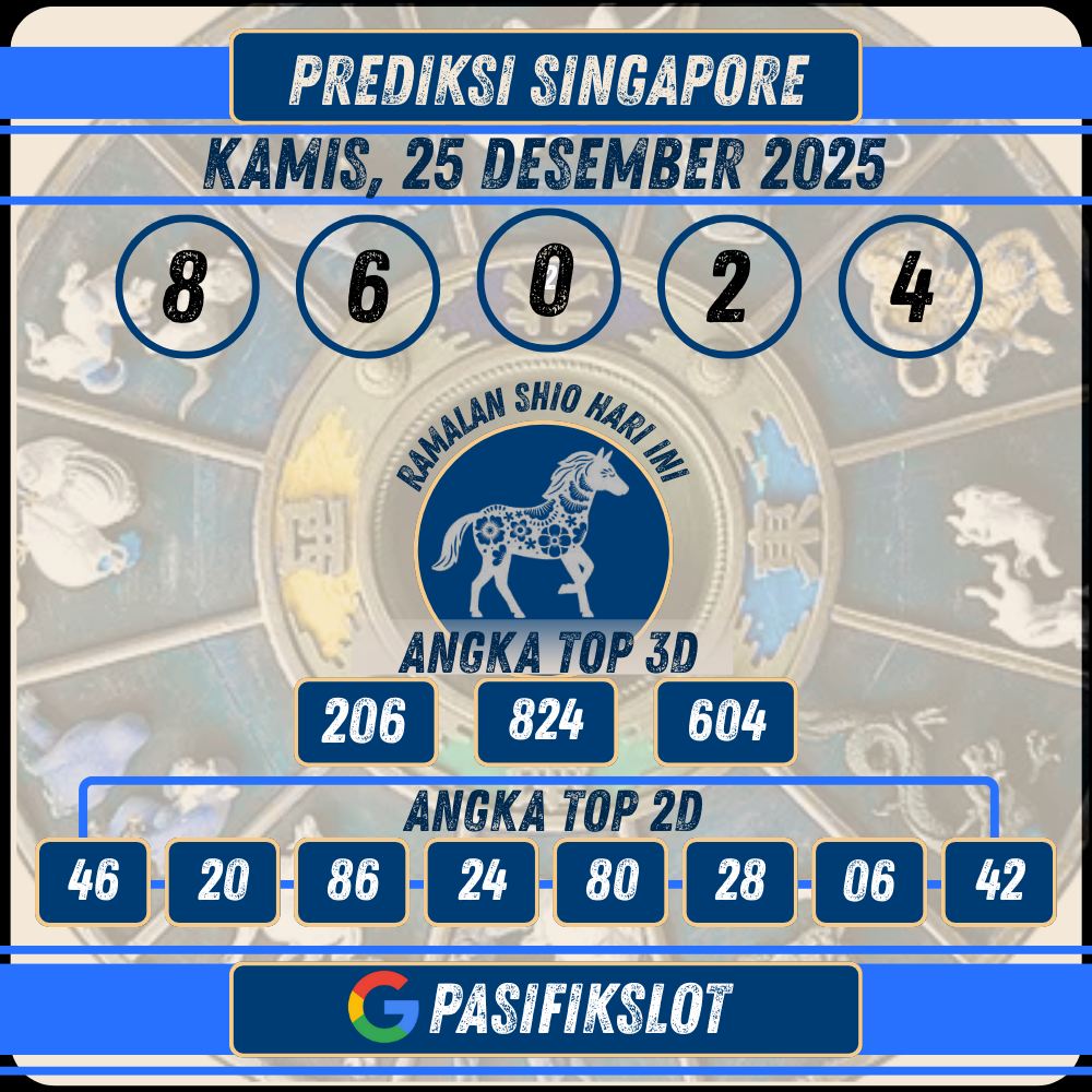 PASIFIKSLOT | Selamat datang di halaman prediksi togel Singaporepools terbaru untuk tanggal 25 Desember 2025. Kami di Pasifikslot selalu berusaha memberikan prediksi angka jitu yang akurat dan terpercaya untuk membantu Anda meraih kemenangan maksimal. Dengan analisis data keluaran sebelumnya dan pola angka, kami menyajikan angka-angka terbaik untuk Anda gunakan sebagai referensi taruhan.