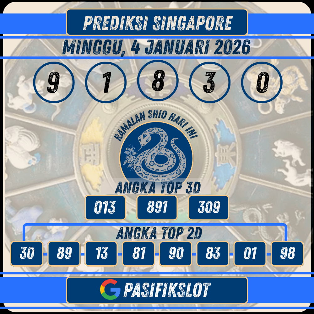 PASIFIKSLOT | Selamat datang di halaman prediksi togel Singaporepools terbaru untuk tanggal 4 Januari 2026. Kami di Pasifikslot selalu berusaha memberikan prediksi angka jitu yang akurat dan terpercaya untuk membantu Anda meraih kemenangan maksimal. Dengan analisis data keluaran sebelumnya dan pola angka, kami menyajikan angka-angka terbaik untuk Anda gunakan sebagai referensi taruhan.