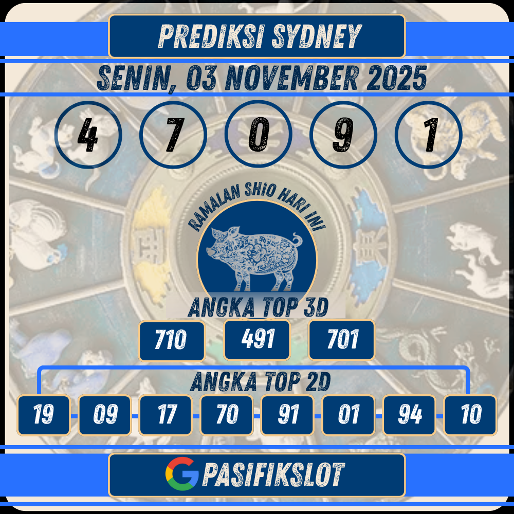 PASIFIKSLOT | Selamat datang di halaman prediksi togel sydneypools terbaru untuk tanggal 03 November 2025. Kami di Pasifikslot selalu berusaha memberikan prediksi angka jitu yang akurat dan terpercaya untuk membantu Anda meraih kemenangan maksimal. Dengan analisis data keluaran sebelumnya dan pola angka, kami menyajikan angka-angka terbaik untuk Anda gunakan sebagai referensi taruhan.