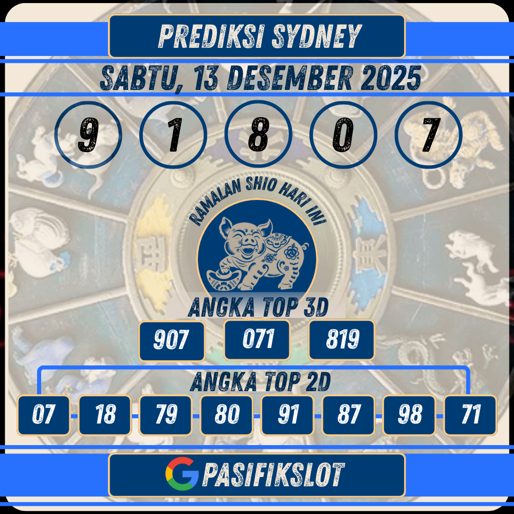 PASIFIKSLOT | Selamat datang di halaman prediksi togel sydneypools terbaru untuk tanggal 13 Desember 2025. Kami di Pasifikslot selalu berusaha memberikan prediksi angka jitu yang akurat dan terpercaya untuk membantu Anda meraih kemenangan maksimal. Dengan analisis data keluaran sebelumnya dan pola angka, kami menyajikan angka-angka terbaik untuk Anda gunakan sebagai referensi taruhan.