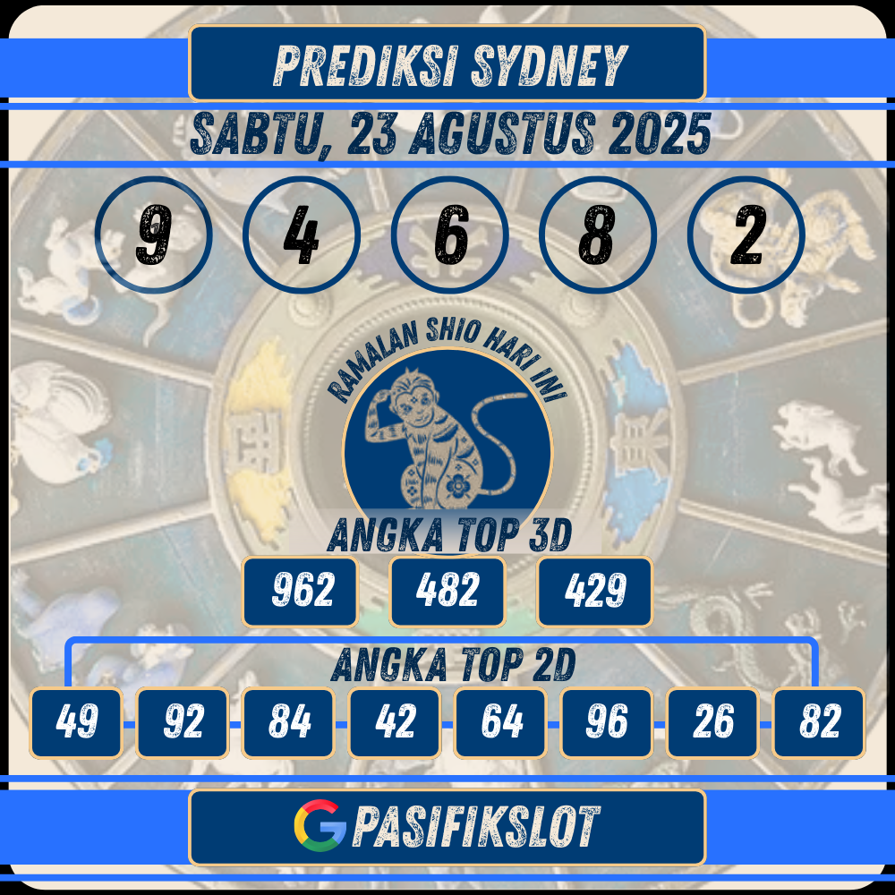 PASIFIKSLOT | Selamat datang di halaman prediksi togel sydneypools terbaru untuk tanggal 23 Agustus 2025. Kami di Pasifikslot selalu berusaha memberikan prediksi angka jitu yang akurat dan terpercaya untuk membantu Anda meraih kemenangan maksimal. Dengan analisis data keluaran sebelumnya dan pola angka, kami menyajikan angka-angka terbaik untuk Anda gunakan sebagai referensi taruhan.