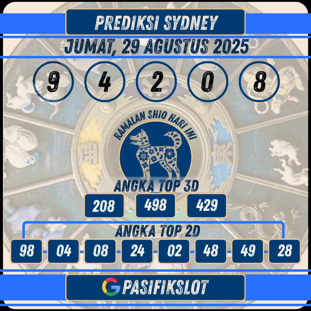 PASIFIKSLOT | Selamat datang di halaman prediksi togel sydneypools terbaru untuk tanggal 29 Agustus 2025. Kami di Pasifikslot selalu berusaha memberikan prediksi angka jitu yang akurat dan terpercaya untuk membantu Anda meraih kemenangan maksimal. Dengan analisis data keluaran sebelumnya dan pola angka, kami menyajikan angka-angka terbaik untuk Anda gunakan sebagai referensi taruhan.